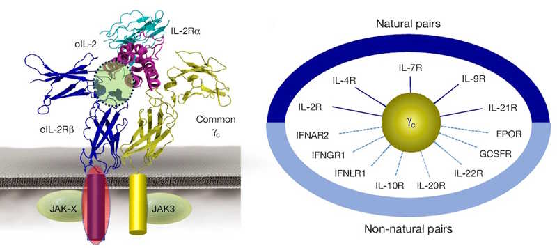 Для расширения сигнального кода ученые комбинировали общую гамма-цепь рецепторов интерлейкинов (γc) с рецепторными молекулами, активирующими JAK-STAT. Они применили ортогональную платформу с мутантным интерлейкином-2 (oIL-2) и мутантным же рецептором к нему (oIL-2Rβ). Их внеклеточные домены избирательно связываются друг с другом, но не с вариантами дикого типа.
