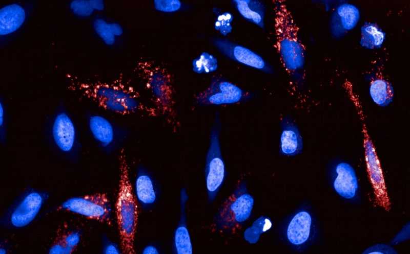 Человеческие клетки экспрессируют белок поксвируса F13 (красный). Синим окрашены ядра клеток.