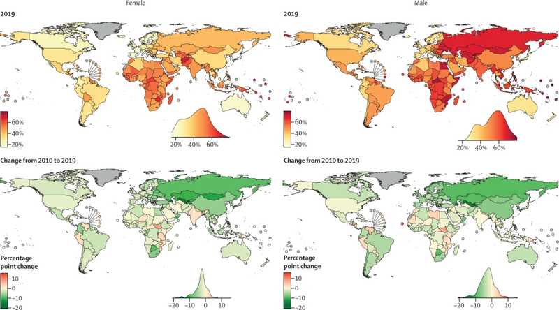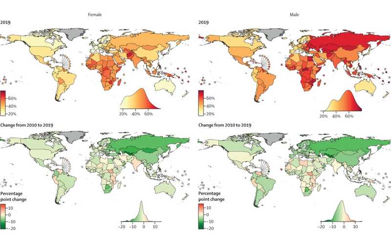 Смертность от неинфекционных заболеваний среди женщин и мужчин до 80 лет в разных странах мира на 2019 год и ее снижение в предшествующее десятилетие. Credit: The Lancet. 2025. DOI: