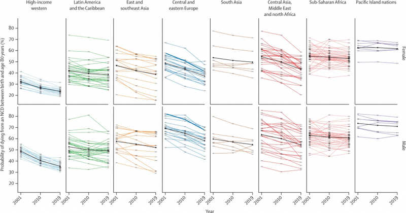 С 2010 по 2019 год риск смерти от хронического заболевания в период от рождения до 80 лет снизился в четырех из пяти стран: в 152 странах (82%) для женщин и в 147 странах (79%) для мужчин. Снижение произошло во всех странах с высоким уровнем дохода в Европе, Северной Америке и Тихоокеанском регионе. Наиболее сильное снижение смертности как среди мужчин, так и среди женщин наблюдалось в Катаре, Азербайджане и Узбекистане.