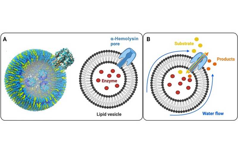 (А) Липидные везикулы образуют компартмент, в котором инкапсулирован фермент. (B) Молекулы субстрата реагируют с ферментами при погружении везикул в градиент субстрата. Затем субстрат преобразуется в молекулы продукта, которые диффундируют наружу преимущественно через поры, создавая локальный градиент концентрации продукта.