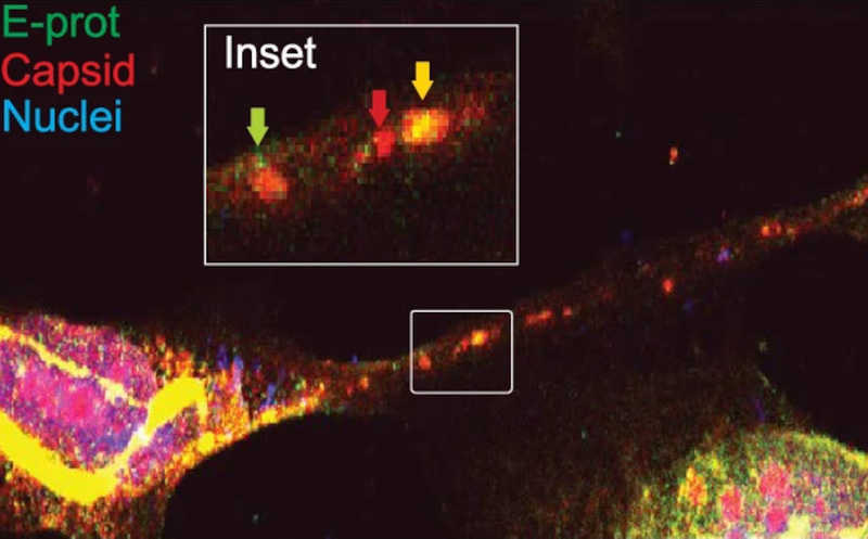 Для проверки функциональной роли нанотрубок в данной модели исследователи окрашивали культуры зараженных клеток антителами к структурным белкам оболочки и капсида вируса. В нанотрубках наблюдались участки колокализации этих двух белков.