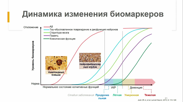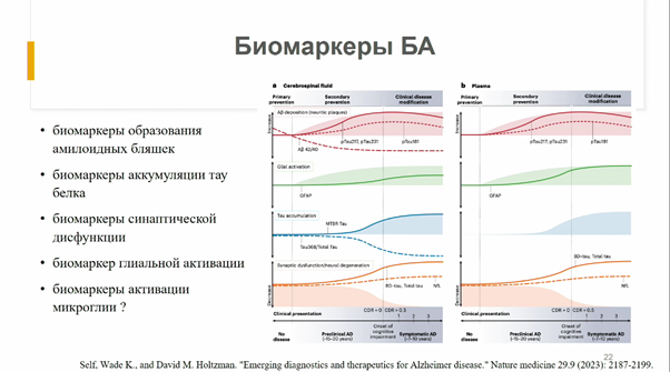 Подтвердить диагноз биомаркерами важно еще и для того, чтобы назначить пациенту подходящее лечение. При этом важно поставить диагноз как можно раньше, желательно — до проявления клинических симптомов, когда патологический процесс уже запущен. В связи с этим исследователи обсуждают многие другие биомаркеры, которые могут быть определены даже на бессимптомной стадии и указывать на ту или иную форму БА, тяжесть протекания болезни и т.д.