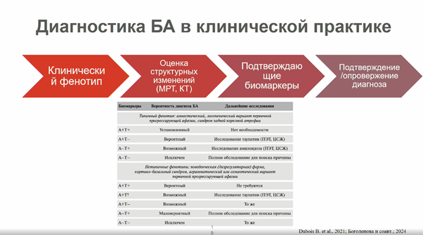 Для постановки диагноза врачам необходимо обращаться как к клиническим, так и к биологическим критериям. Они должны принимать в учет не только клиническую картину, но и результаты анализа биомаркеров. В мире анализ биомаркеров для диагностики БА используется уже более 15 лет, однако такие тесты все еще не вошли в регулярную клиническую практику в России.