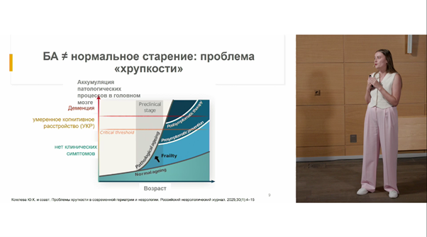 Важно понимать, что любая деменция — это не нормальный вариант старения. При развитии патологического варианта старения основными стадиями когнитивных нарушений являются умеренное когнитивное расстройство (УКР), когда когнитивные нарушения не мешают повседневной активности человека, и стадия деменции, когда такие нарушения более выражены и значимо нарушают повседневную активность человека. Между нормальным старением и патологическим лежит состояние так называемой «хрупкости», когда организм человека становится более уязвимым к различным стрессам и патологическим изменениям. Если состояние хрупкости не скорректировать, оно может привести к развитию полноценной деменции.