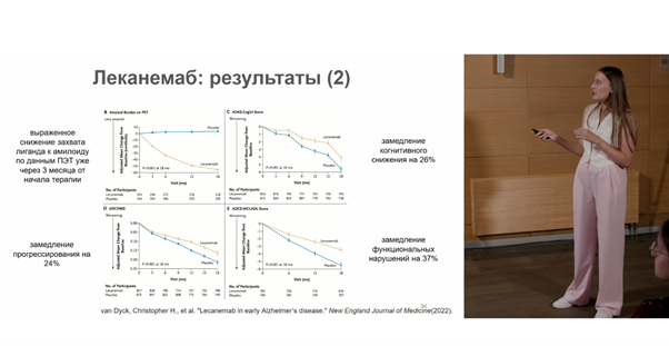 Несколько лет назад в мире начали появляться инновационные препараты патогенетического лечения БА, так называемая антиамилоидная терапия. Данные препараты представляют собой антитела, которые либо препятствуют образованию бляшек, либо способствуют их растворению. Одним из первых одобренных препаратов стал леканемаб, который был одобрен в США в конце 2023 года. В клинических испытаниях леканемаба 3 фазы приняли участие 1795 пациентов с ранней стадией БА (УКР или легкая деменция), у которых была подтвержденная амилоидная патология. Пациентов делили на группу плацебо и группу леканемаба; они получали терапию внутривенно каждые 2 недели в течение 18 месяцев. Прогресс пациентов оценивали по различным шкалам (CDR-SB, ADAS-Cog14 и т.д.). В результате лечения леканемабом у пациентов на 27% замедлялось прогрессирование деменции при оценке по шкале CDR-SB: у них улучшились память, координация в пространстве, коммуникация, хобби, самообслуживание в быту и т.д. Наблюдались улучшения и по другим шкалам, а по данным ПЭТ уже через 3 месяца от начала терапии снижался захват лиганда к бета-амилоиду.