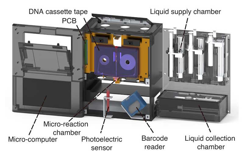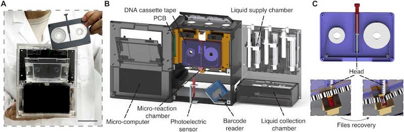 Наконец, авторы публикации автоматизировали систему — они разработали кассету для ДНК-ленты, которая была сопоставима по размеру с коммерческими ленточными накопителями. Конструкция содержала четыре основных части: микрокомпьютер, моторную систему, систему адресации и систему подачи жидкости. Предустановленная программа в микрокомпьютере управляла тремя другими системами, чтобы обеспечить автоматическую адресацию файлов ДНК, их чтение, удаление и повторную запись.