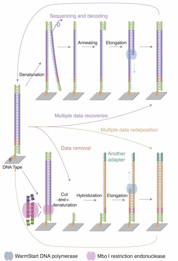 Принцип удаления и повторной записи основан на использовании рестриктазы. Конструируя олигонуклеотиды для перезаписи информации, ученые руководствовались тем, что разрезание должно происходить в начале 5′-конца сайта распознавания, а сам сайт должен быть как можно короче из соображений экономии. Они выбрали рестриктазу Mbo I с сайтом узнавания в 4 нуклеотида (5′-GATC), которая позволяла сохранить участок заякоривания на ленте, чтобы к нему можно было присоединить новый фрагмент. Ученые убедились, что после 10 циклов «стирания» и повторной записи файла количество копий ДНК практически не менялось.