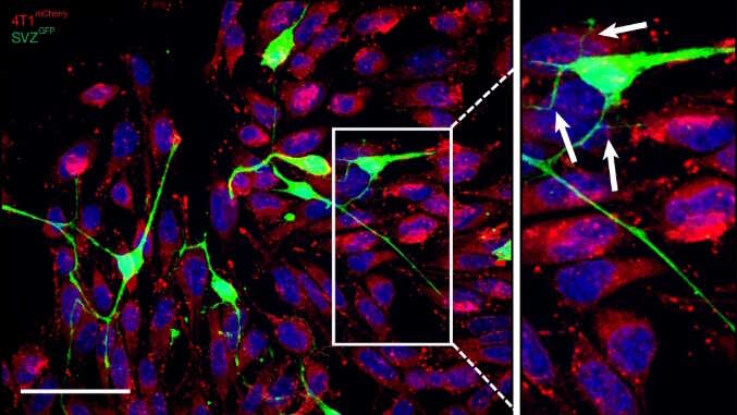 Исследователи наблюдали, как между клетками рака молочной железы и нейронами формировались «мостики», по которым меченные красителем митохондрии перемещались к раковым клеткам. Опухолевые клетки без митохондрий приобретали способность делиться, если культивировать их с нейронами.