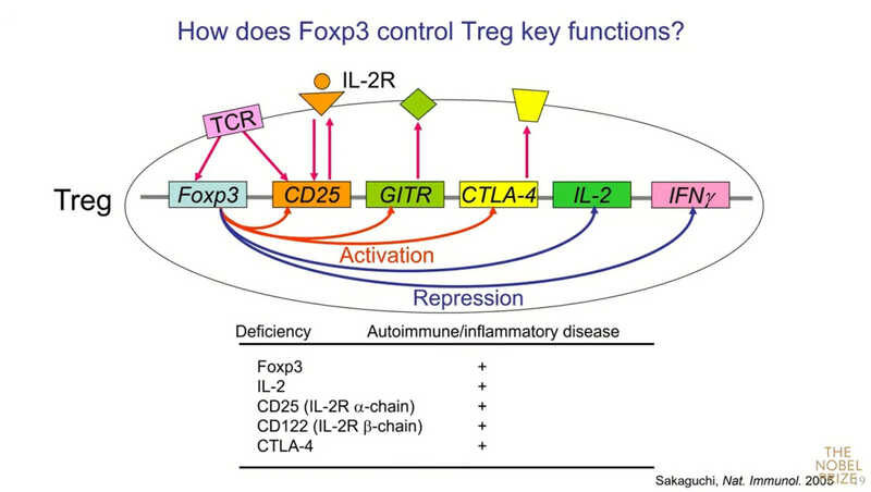 Ключевая особенность Treg — то, что они конститутивно экспрессируют высокоафинный рецептор к IL-2 (это и есть CD25). Его экспрессия начинается, когда клетки еще находятся в тимусе. Foxp3 подавляет продукцию самого IL-2. Когда активируются обычные Т-лимфоциты, то они продуцируют IL-2 и рецептор к нему. Регуляторные Т‑клетки экспрессируют только рецептор к IL-2, но не сам IL-2. Их созревание и выживание полностью зависит от внешнего IL-2. Поэтому, если ввести нейтрализующее антитело к IL-2, то почти немедленно можно увидеть резкое сокращение числа Treg как в селезенке, так и в тимусе, а затем тяжелое аутоиммунное заболевание.