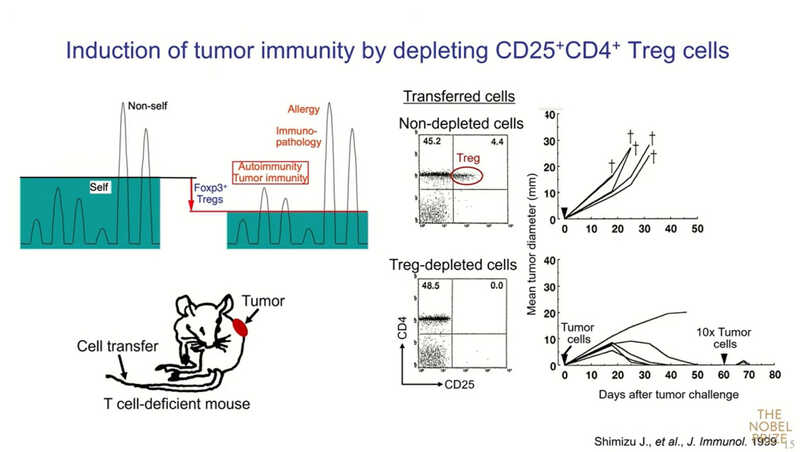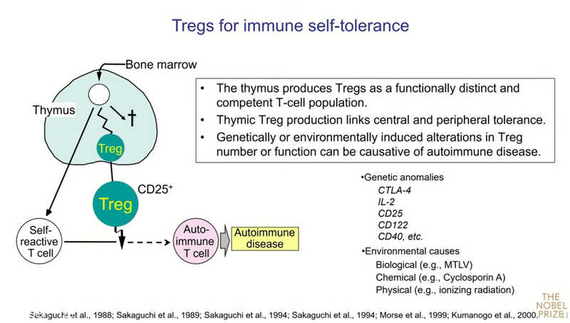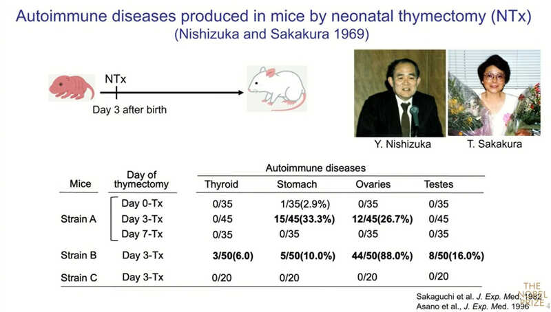 «Что мы обнаружили: если после неонатальной тимэктомии инокулировать таким мышам нормальные Т-клетки от взрослых мышей, особенно CD4⁺ Т-клетки, то развитие аутоиммунных заболеваний можно предотвратить, — рассказывает нобелевский лауреат. —Наша гипотеза заключалась в том, что поскольку при тимэктомии на третий день после рождения развивается аутоиммунитет, это означает, что, возможно, до этого тимус уже успел сгенерировать аутоиммунные Т-клетки. Примерно к трем суткам он начинает вырабатывать другую, особую популяцию — клетки, супрессирующие аутоиммунные реакции. Сегодня мы называем их регуляторными Т‑клетками.
