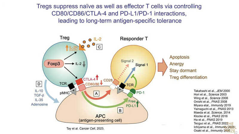 Нобелевский лауреат коротко описал актуальные представления о том, какие молекулы экспрессируются регуляторными T-клетками и как они участвуют в иммуносупрессии. CTLA-4 взаимодействует с CD80 и CD86 — так называемыми костимуляторными молекулами на поверхности антигенпрезентирующих клеток (АПК). У эффекторной клетки распознавание антигена наряду с костимуляцией вызывает активацию и деление. Treg конкурируют с эффекторными клетками за CD80/CD86 с помощью CTLA-4 и снижают экспрессию, буквально забирая их с поверхности АПК путем транс-эндоцитоза. То есть, во-первых, Т-регуляторные клетки напрямую подавляют костимуляторный сигнал.