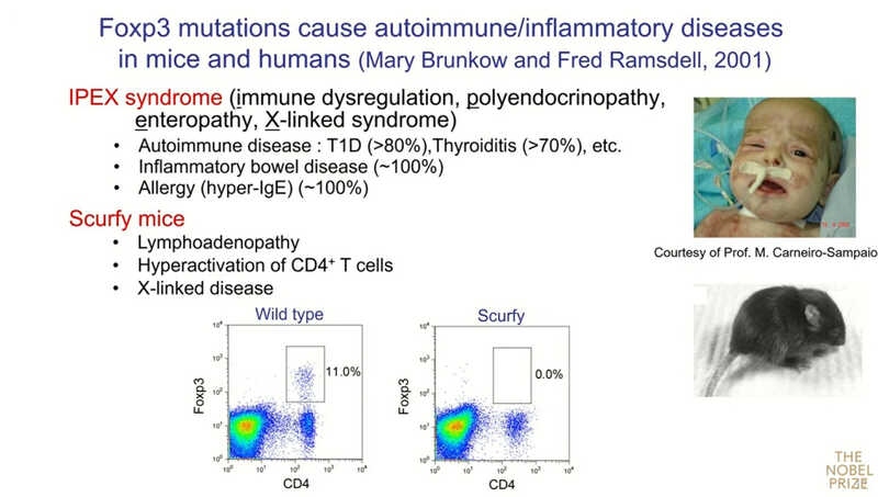 Следующий вопрос: работает ли обнаруженный механизм у людей? Важные данные были получены Мэри Брункоу и Фредом Рамсделлом в 2001 году. Они показали, что мутации в гене, который они назвали Foxp3, приводят к редкому заболеванию у человека — IPEX-синдрому (Immune dysregulation, Polyendocrinopathy, Enteropathy, X-linked syndrome). Это моногенное заболевание сопровождается аутоиммунным поражением множества органов. У детей развиваются сахарный диабет 1 типа, тиреоидит, тяжелое воспалительное заболевание кишечника, а после введения прикорма начинаются аллергии. Сходная картина заболевания была у мышей линии scurfy, с изучения которых началась работа Брункоу и Рамсделла.
