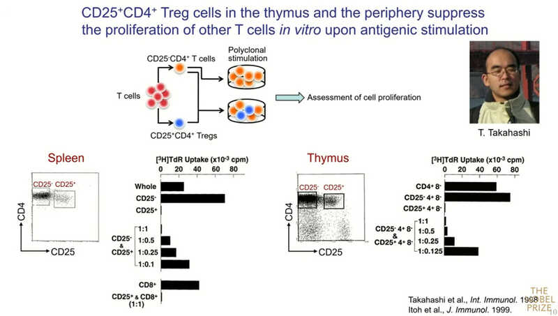 «Мы можем продемонстрировать их супрессивную активность in vitro. В селезенке около 10% всех CD4⁺ Т‑клеток положительны по CD25, а в тимусе их от 5 до 10%. Если удалить CD25⁺ клетки в селезенке, то CD25⁻ клетки начинают активно размножаться в ответ на собственные антигены. А если в такую культуру добавить обратно CD25⁺ клетки, то пролиферация CD25⁻ клеток сильно подавляется, причем эффект является дозозависимым. Они подавляют даже пролиферацию CD8⁺ Т-клеток. Также и в тимусе CD25⁺ клетки способны подавлять пролиферацию других лимфоцитов», — рассказывает Симон Сакагути.