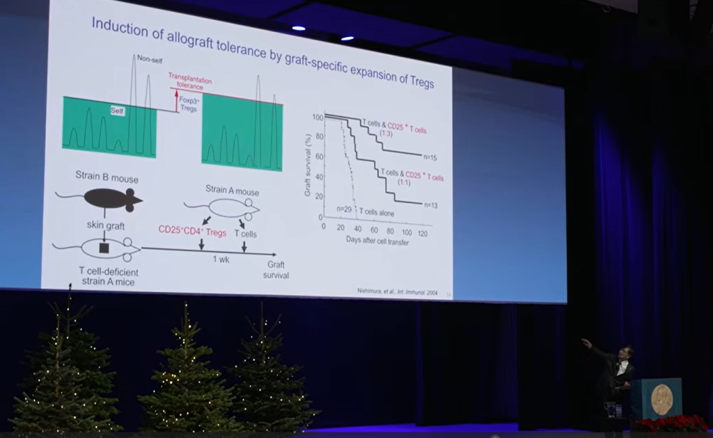 «Потенциально аутореактивные Т-лимфоциты присутствуют у каждого здорового индивида, но постоянно подавляются регуляторными Т-клетками (Treg). Граница между “своим” и “не-своим” четко не зафиксирована. Она может смещаться в зависимости от числа Treg. Аутоиммунные заболевания можно лечить, противоопухолевый иммунитет — вызывать, а трансплантационную толерантность — устанавливать, контролируя количество и функцию Treg». — Лекция лауреата Нобелевской премии 2025 года по физиологии и медицине Симона Сакагути. Стокгольм, 07.12.2025.