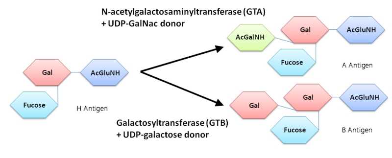 У людей с группами крови А, В и О вырабатывается антиген-предшественник Н. Он остается неизменным в группе О; люди с группой А имеют ген фермента, присоединяющего к Н остаток N-ацетилгалактозамина, люди с группой В — фермента, присоединяющего дополнительный остаток галактозы. Удаление присоединенного остатка может превратить А- или В-антиген в Н-антиген. Credit: proteopedia.org