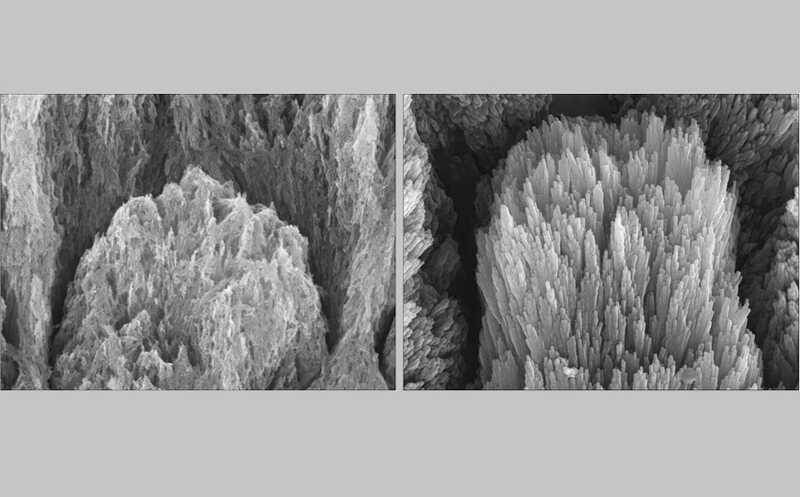 При погружении покрытых матрицей образцов в раствор, перенасыщенный фторапатитом, происходила нуклеация и рост ориентированных нанокристаллов апатита. Уже через 24 часа формировались слои толщиной до 10 мкм, воспроизводящие микроструктуру эмали. Покрытие демонстрировало способность к регенерации даже с поверхности дентина, где кристаллы вырастали из коллагеновых фибрилл, напоминая естественное соединение на границе дентин–эмаль.
