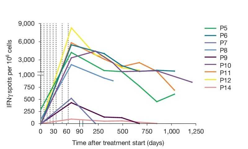 У всех участниц развился выраженный Т-клеточный ответ, причем у всех, кроме одной, наблюдался Т-клеточный ответ против множества неоантигенов. Для девяти человек были доступны данные по долгосрочной персистенции Т-клеток против неоантигенов (реагирующих на их присутствие экспрессией интерферона гамма, которую можно детектировать в тесте ELISpot). У шести уровень Т-клеток оставался высоким на протяжении нескольких лет, в том числе у умершей по неизвестной причине. Еще у трех, включая двух умерших после рецидива, реактивные Т-клетки со временем исчезли.