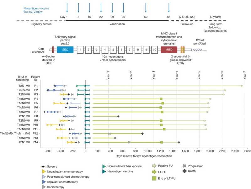 Строение мРНК вакцины и график наблюдения за участницами исследования и терапевтические вмешательства (LT-FU — долгосрочное наблюдение, long-term follow-up). Слева указаны начальные баллы TNM пациенток (система стадирования рака, учитывающая размер первичной опухоли, распространение на близлежащие лимфоузлы и наличие отдаленных метастазов; низкие значения соответствуют наиболее ранним стадиям). Credit. Nature (2026). DOI: 10.1038/s41586-025-10004-2 | CC BY 4.0