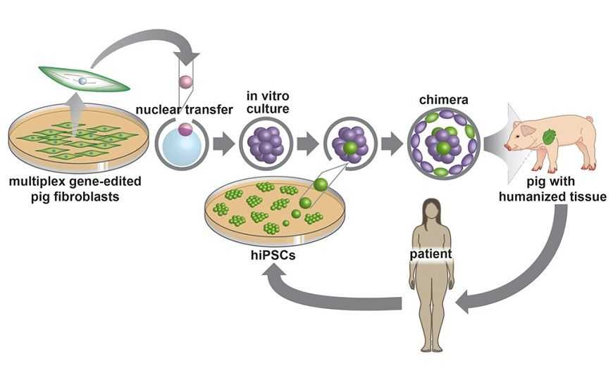 Человеческие индуцированные плюрипотентные клетки можно использовать для создания гуманизированных органов, внедряя их в бластоцисту свиньи. (Из статьи Мэри Гэрри и Дэниела Гэрри, в которой рассматривается возможность создания гуманизированного сердца для трансплантации.)