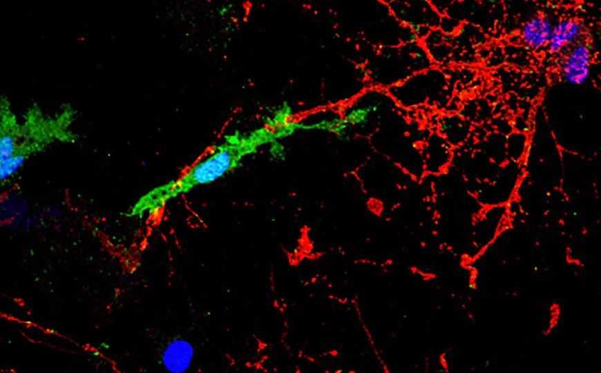 Клетка микроглии (зеленая) контактирует с миелинизированным аксоном (красный). В присутствии оболочечного белка pHERV-W это взаимодействие ведет к повреждению аксона. Синим показаны ядра клеток.