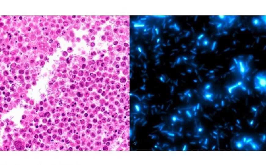 Бактерии, растущие в областях некроза лимфомы (слева). Бактерии, запрограммированные на прохождение волн роста и самоуничтожения, приводящих к высвобождению иммунотерапевтического препарата (справа).