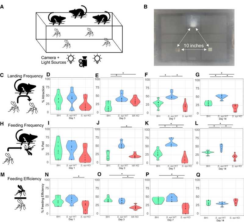 В этом тесте комары A. aegypti взаимодействовали с мышами, обработанными S. epidermidis WT, S. epidermidis Δl-ldh или средой BHI, и могли выбрать, кого из них укусить. Как и ожидалось, комары реже выбирали мышей с S. epidermidis Δl-ldh. Более того, эффективность кормления (отношение комаров, укусивших мышь, к комарам, приземлившимся на мышь) была снижена у мышей, колонизированных S. epidermidis Δl-ldh, по сравнению с обработанными диким штаммом.