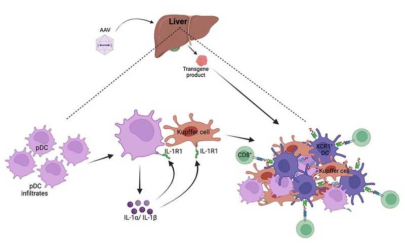 Далее авторы решили выяснить, какие клетки, инфильтрующие печень, продуцируют IL-1. Окраска на IL-1a и на различные поверхностные маркеры выявила клетки, экспрессирующие B220 и PDCA-1, — это плазмацитоидные дендритные клетки (pDC). Окрашивание на IL-1a и XCR1 выявило взаимодействие pDC с миелоидными дендритными клетками, с клетками Купфера и с CD8+ Т-лимфоцитами. С помощью проточной цитометрии авторы показали значительное повышение количества клеток Купфера и pDC через 1-2 недели после введения AAV. Эти результаты позволяют предположить, что иммунный ответ в печени на генную терапию зависит от взаимодействия XCR1+ миелоидных дендритных клеток с плазмацитоидными дендритными клетками и с клетками Купфера.