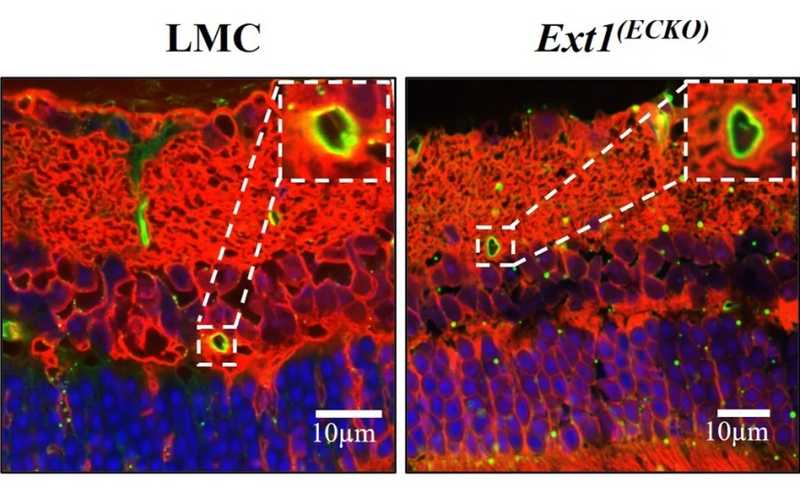 Полученные данные подтвердились и на еще одной модели нарушения метаболизма гепарансульфата. Ученые использовали мышей Ext1(ECKO), которым нокаутировали ген, кодирующий фермент экзотозин, избирательно в эндотелиоцитах сосудов. Экзотозин участвует в синтезе и полимеризации гепарансульфата, и дисфункция этого фермента приводила к уменьшению количества гепарансульфата в эндотелиальном гликокаликсе сосудов. Это способствовало уменьшению толщины гликокаликса в сосудах сетчатки и почечных клубочков. Как и в предыдущей модели, гликокаликс подоцитов остался без изменений, но проницаемость клубочковых сосудов для альбумина все равно возросла.