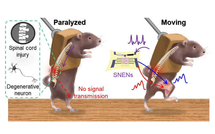 Ученые из Южной Кореи и США создали растяжимый нейроморфный эфферентный нерв (stretchable neuromorphic efferent nerve, SNEN) и с его помощью управляли движением лап мышей. SNEN фактически заменяет собой пораженный нерв, передавая нейроморфный электрический сигнал мышце.