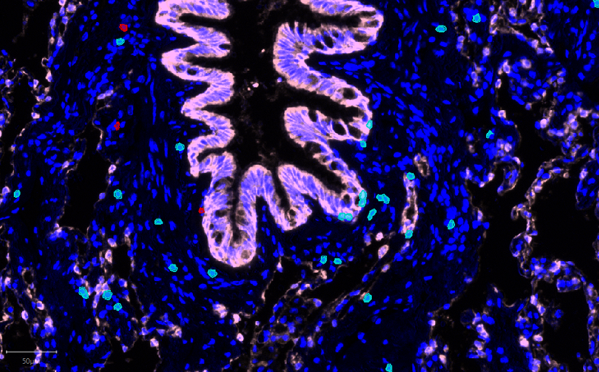 TRM (цвета морской волны и красные) в легких курильщика. Дыхательные пути обозначены розовым, ядра — синим.