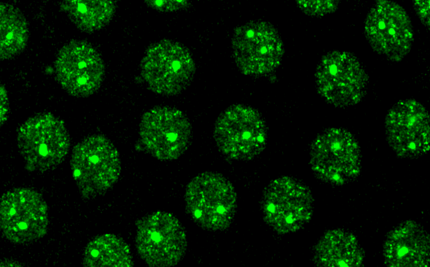 В клетках дикого типа авторы выявили большое количество дискретных спеклов РНК-полимеразы II. Два спекла в каждом ядре были заметно больше, чем остальные, и представляли собой тельца гистоновых локусов — скопления транскрипционных факторов, отвечающих за транскрипцию и процессинг гистоновых РНК.