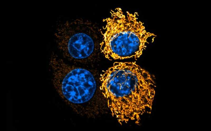 Опухолевые клетки в кислой среде изменяют структуру и функцию митохондрий (окрашены желтым). При нейтральном рН (слева) они фрагментированы, а при закислении среды образуют протяженные сети (справа).