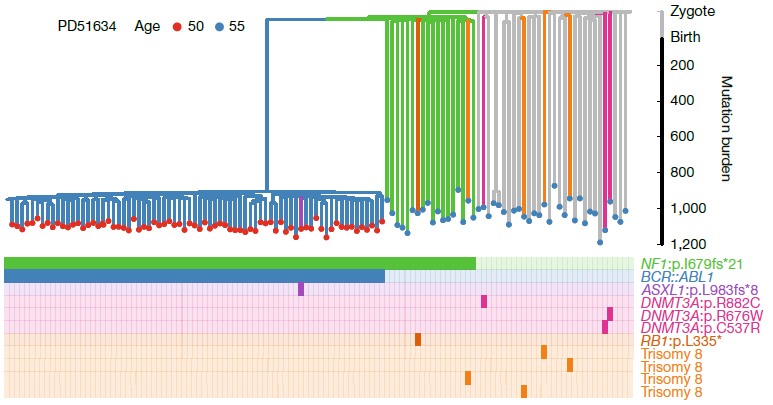 Используя результаты секвенирования, авторы построили филогенетические деревья для неопластических и нормальных гемопоэтических клеток. Это визуализировало стремительную клональную экспансию опухолевых клеток после появления драйверной мутации BCR::ABL1. С помощью математического моделирования авторы рассчитали время от возникновения BCR::ABL1-позитивного опухолевого клона до установления диагноза. Для двух самых молодых пациентов (22 года и 36 лет) оно было наиболее коротким — 3,2 года и 3,9 лет. При этом скорость роста опухолевого клона составила соответственно 99 000 000% и 26 800% в год (что соответствует удвоению опухолевой популяции каждые 18 и 45 дней). Для трех пациентов среднего возраста (45-55 лет) этот промежуток составил от 4,4 до 6,3 лет. Для самых старших пациентов (52 года, 61 год, 81 год) время от возникновения клона до диагностики ХМЛ было наибольшим (13,1 года, 14 лет и 10,3 года соответственно).