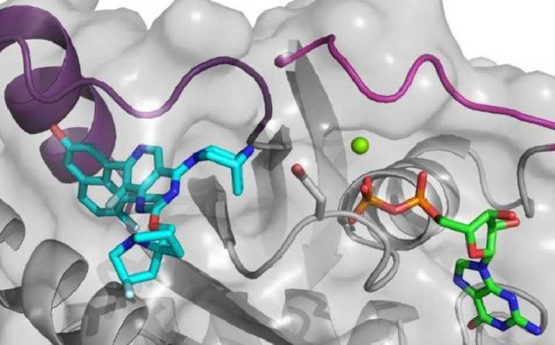 Ингибитор MRTX1133 (бирюзовый) взаимодействует с KRASG12D и гуанозиндифосфатом