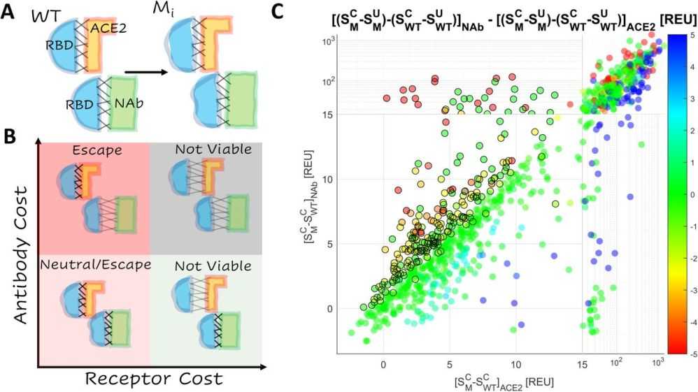 Опасным может оказаться новый вариант вируса, RBD которого прочно связывается с клеточным рецептором (то есть вирус сохраняет способность поражать клетку) и при этом непрочно — с нейтрализующими антителами против старых вариантов коронавируса (вирус ускользает от иммунного ответа у переболевших или вакцинированных). Вопрос, насколько вероятно появление новых таких вариантов, волнует всех. А произойти это может за счет эпистаза — комбинации мутаций, которая изменит структуру RBD, придав ему два взаимоисключающих на данный момент свойства.