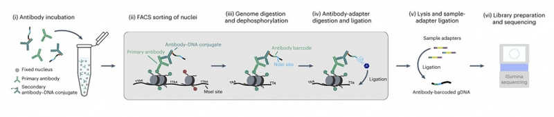 Принцип метода заключается в том, что ДНК-баркоды доставляются к участкам ДНК, на которых находятся белки мишени, с помощью антител. Собранные для исследования клетки инкубируют с первичным антителом, а затем со вторичным антителом, к которому пришит адаптер — молекула ДНК, содержащая характерную последовательность (баркод). После сортировки клеточных ядер методом проточной цитометрии геномы фрагментируют рестриктазой MseI, распознающей мотив TTAA, и дефосфорилируют, чтобы предотвратить лигирование фрагментов. Затем обрабатывают рестриктазой NdeI, которая распознает сайт в адаптере и образует липкий конец, совместимый с тем, что образуется при рестрикции MseI. В итоге адаптер можно лигировать с тем фрагментом ДНК, на котором находится белок-мишень первичного антитела. После этого проводится деградация белков и образуются фрагменты ДНК, причем баркодами помечены фрагменты, с которыми был связан тот или иной белок хроматина. Секвенирование позволит определить их положение в геноме. Благодаря адаптерам образцы можно пулировать при подготовке библиотек.