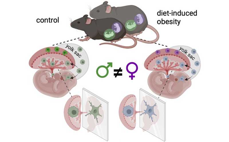 Затем исследователи изучили, могут ли клетки Хофбауэра отражать изменения микроглии в модели ожирения, индуцированного высокожировой диетой у мышей. Ученые обнаружили, что гены, дифференциально экспрессированные в условиях материнского ожирения, чаще всего были общими между кластерами микроглии эмбриона и клетками Хофбауэра. К тому же, активированные кластеры включали гены, вовлеченные в регуляцию иммунитета и гликолиза. Интересно, что пол плода влиял на то, как материнское ожирение сказывается на его плаценте и мозге. В частности, у самцов было больше нейровоспалительных сигналов, чем у самок; также у них нарушалась экспрессия большего числа генов плацентарных макрофагов и микроглии.
