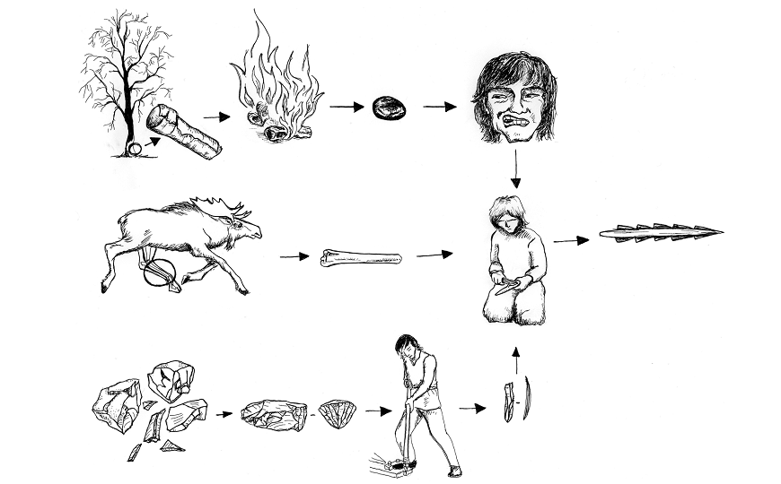 Технологическая цепочка производства костяного наконечника с кремнёвыми лезвиями включала жевание березового дегтя. Комочки дегтя со следами зубов найдены при раскопках многих северных мезолитических поселений, в том числе и в Хусебю Клев.