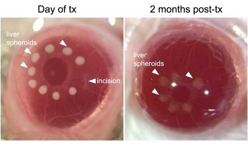 Исследователи из Каролинского института подсадили в глаз мышей сфероиды, полученные из гепатоцитов, чтобы отслеживать состояние печени in vivo. Они показали, что сфероиды прикрепляются к радужной оболочке глаза и снабжаются кровеносными сосудами и нервами, необходимыми для их функционирования и выживания. При этом их клетки сохраняют типичные характеристики печени и могут отражать состояние здоровья печени животного.
