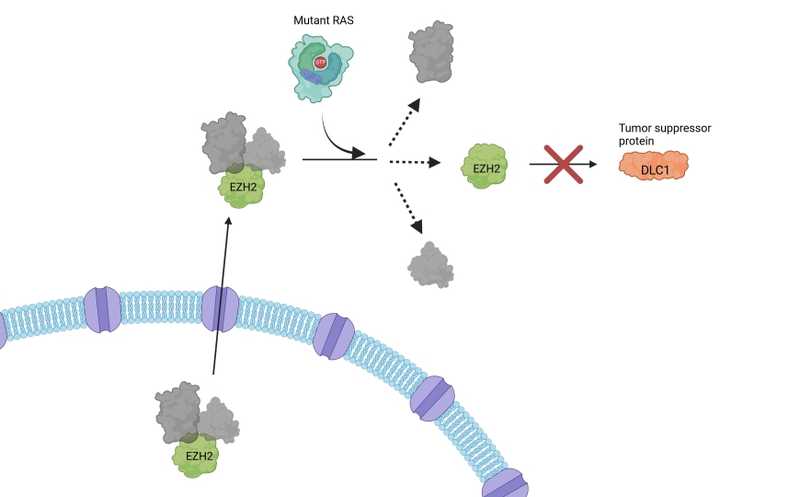 Мутантный RAS помогает высвобождению белка EZH2 из комплекса, транспортируемого из ядра в цитоплазму. EZH2 способствует распаду белка-супрессора опухолей DLC1, что приводит к неконтролируемому росту опухоли.