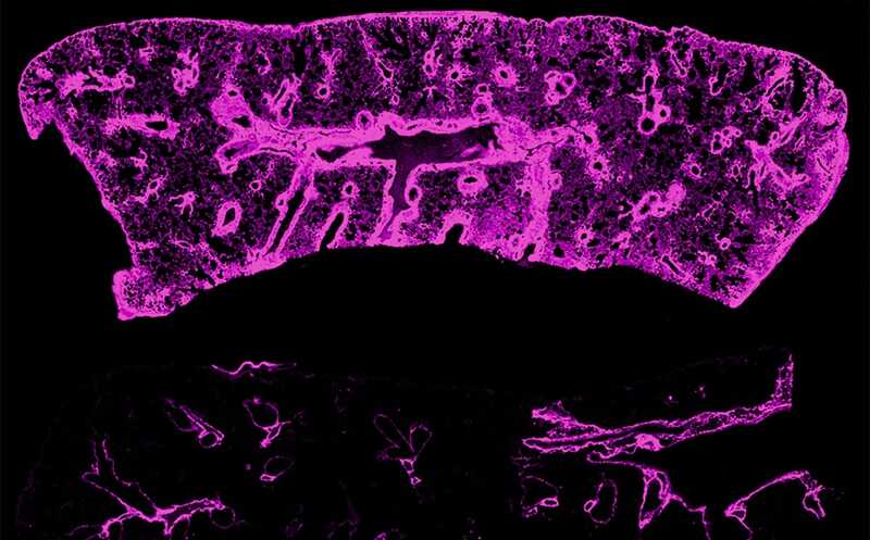 Молекула сахара, называемая гиалуронаном, показана розовым цветом. Легкое, пересаженное генетически идентичным мышам, насыщено рубцовой тканью, содержащей большое количество гиалуронана (верхняя половина изображения). После лечения, стимулирующего рост лимфатических сосудов, накопление гиалуронана значительно снижается (нижняя часть).