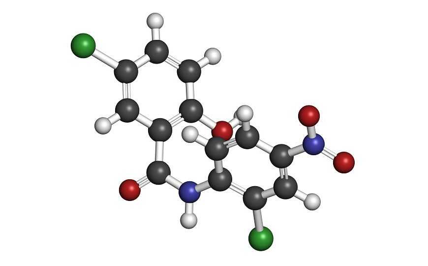 Никлозамид — это антигельминтный препарат, применяемый при заражении ленточными червями. Он был очень активен против SARS-CoV-2 (концентрация полумаксимального ингибирования IC50 составила 0,28 мкM). Известно, что он эффективен против широкого спектра вирусов, в том числе против SARS-CoV и MERS-CoV.