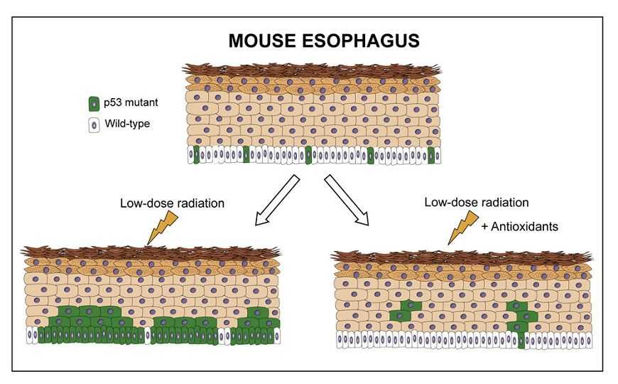В работе, опубликованной в Cell Stem Cell, ученые из Великобритании поставили вопрос: будут ли быстрее распространяться клетки с мутацией в гене р53 после окислительного стресса, вызванного низкой дозой радиации? В качестве модельного объекта использовали эпителий пищевода мыши, который состоит из нескольких слоев постепенно дифференцирующихся кератиноцитов. Исследователи сфокусировались именно на гене p53 (у человека — TP53, у мыши — Trp53), так как мутации в нем тесно связаны с трансформацией клеток в раковые: в норме p53 мутирован в 5–10% клеток, но в раковом эпителии такая мутация присутствует практически во всех клетках.