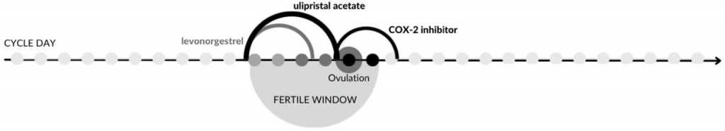 Окно эффективности экстренной оральной контрацепции в типичном 28-дневном цикле, оцененное исходя из предположения о выживании сперматозоидов в половых путях женщины до 5 дней и восприимчивости ооцитов на протяжении 24 часов после овуляции. Полукруги — ранее установленные периоды применения различных препаратов