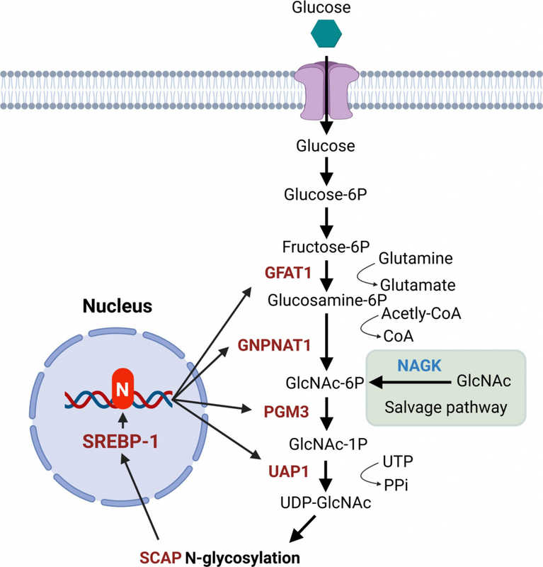 Дальнейшие эксперименты позволили выявить новый, ранее не описанный механизм, объясняющий высокую эффективность ингибирования PGM3. Было установлено, что между активностью SREBP-1 и синтезом гексозаминов существует положительная обратная связь. SREBP-1, помимо регуляции липидного обмена, активирует также транскрипцию ключевых ферментов гексозаминового пути, включая GFAT1, GNPNAT1, PGM3 и UAP1. Достаточный уровень гексозаминов способствует N-гликозилированию белка SCAP, необходимого для активации самого SREBP-1. Блокировка PGM3 разрывает эту самоподдерживающуюся цепь, что ведет к одновременному снижению синтеза гексозаминов и ослаблению активности SREBP-1, в результате чего эффективно подавляется рост глиобластомы.