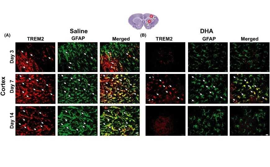 Сразу же после начала ишемии мозга в районе «ишемической полутени» (области, где клетки не погибают, но и не могут нормально функционировать из-за недостатка кислорода) начинает активно накапливаться докозагексаеновая кислота (ДГК) — длинноцепочечная омега-3-полиненасыщенная жирная кислота. Американские ученые предположили, что ДГК играет роль медиатора, регулирующего воспалительные процессы и функциональное восстановление нервной ткани. В новой работе они изучили изменение экспрессии MANF и TREM2 под влиянием ДГК, моделируя ишемический инсульт на крысах.