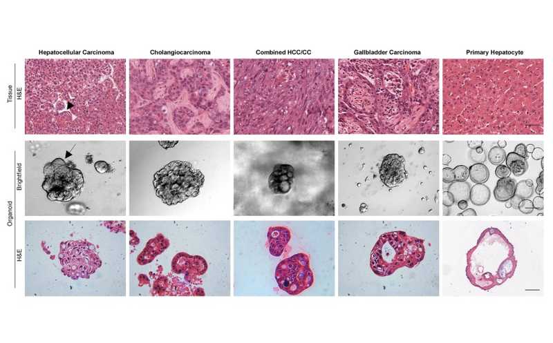 В первую очередь авторы работы создали биобанк из 64 линий органоидов, полученных из гепатобилиарных опухолей пациентов. Они получили 46 органоидов из гепатоцеллюлярной карциномы (ГЦК), 8 — из внутрипеченочной холангиокарциномы (ВПХ), 4 — из комбинированной гепатоцеллюлярной холангиокарциномы (КГХК), 4 — из рака желчного пузыря (РЖП), 1 — из внутригрудной холангиокарциномы (ВГХК) и 1 — из метастатического рака толстой кишки.