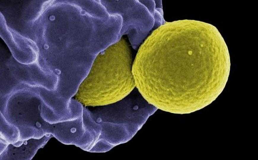 Нейтрофил заглатывает метициллинрезистентный золотистый стафилококк (MRSA). Блокирование ферментов каспаз повышает способность клеток иммунной системы бороться с MRSA и другими опасными кожными инфекциями.