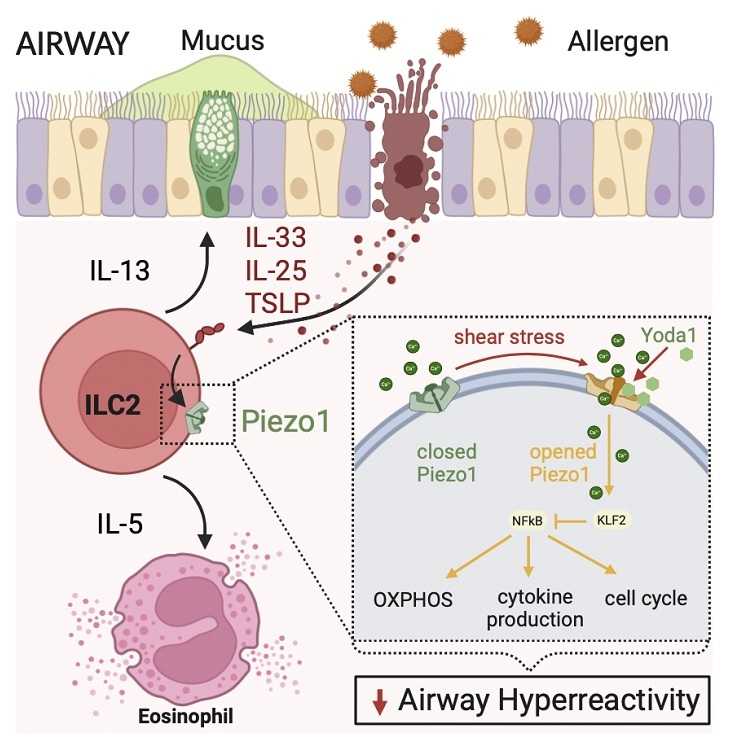 Механочувствительные ионные каналы активируются механическими стимулами, что приводит к деполяризации клеточной мембраны и активации сигнальных путей. В иммунных клетках эти каналы играют важную роль в восприятии микроокружения. Авторы статьи в The Journal of Experimental Medicine показали, что механочувствительные ионные каналы Piezo1 участвуют в регуляции гиперреактивности дыхательных путей, вызванной ILC2 (врожденные лимфоидные клетки группы 2).
